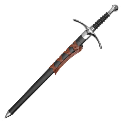 The Twinforge Blade is a sleek fantasy sword styled after the elegant weapons of noble rangers and ancient warriors. With a 23" overall length, it features a unique stainless steel blade divided by a double fuller design that enhances its light, balanced look. The black ribbed handle is framed by a curved silver guard and heavy pommel, giving the piece a clean yet commanding feel. Whether for cosplay, display, or collection, this sword embodies a subtle but powerful energy fit for those who walk the line between kingdoms and wilds.