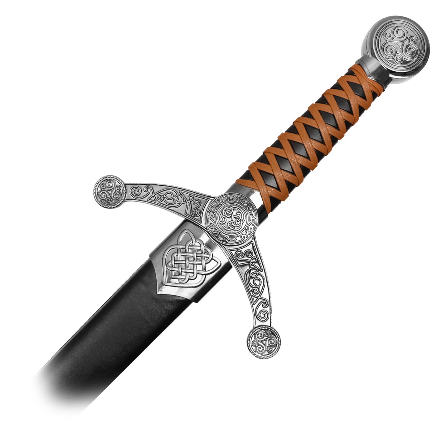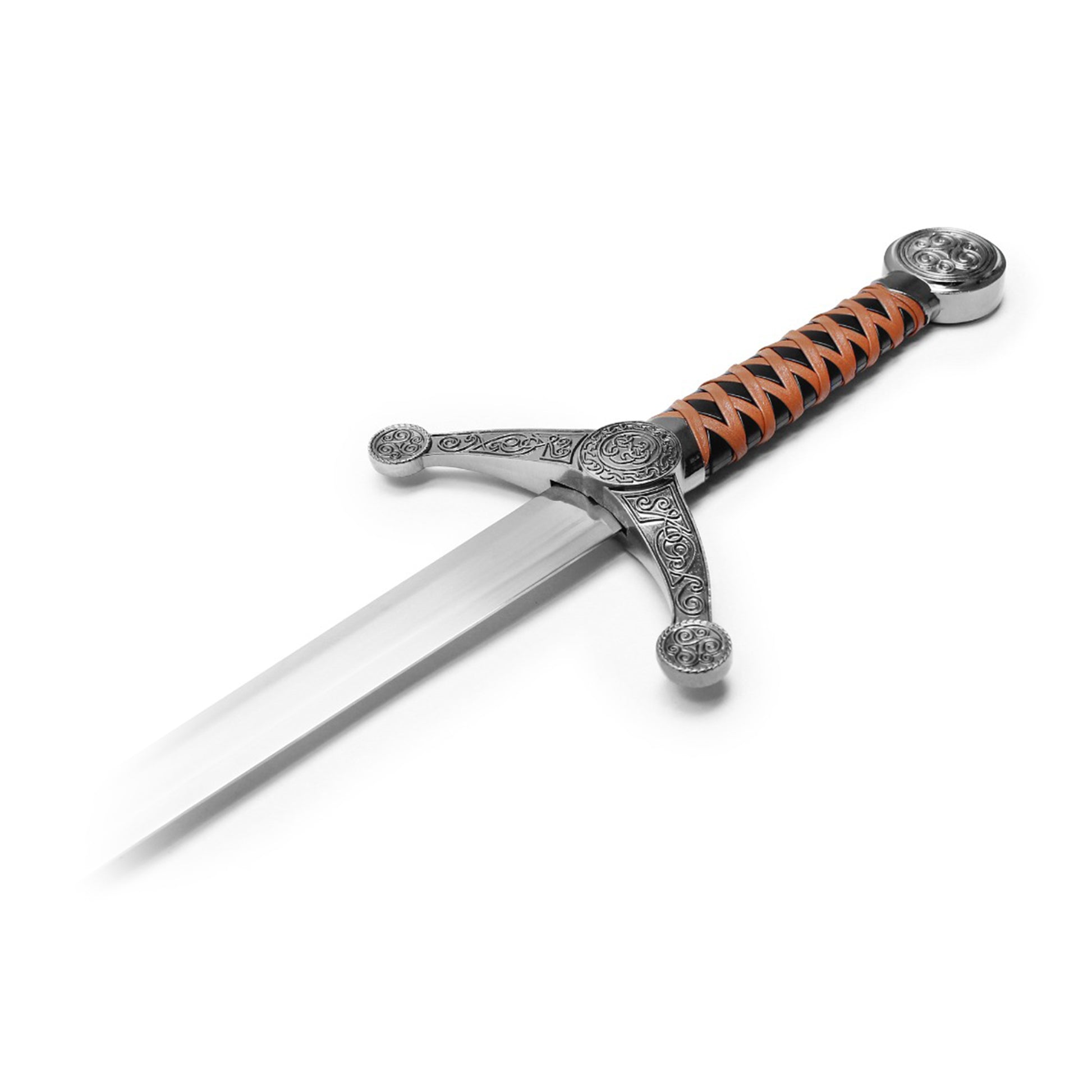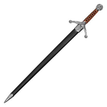 The Claymore Sword is a classic fantasy weapon with a bold presence, measuring 37.5" overall. Featuring a broad 28.5" stainless steel blade and a 9" leather-wrapped handle, this sword offers a striking balance between medieval elegance and battlefield power. Its long, double-edged design is ideal for display or cosplay, channeling the energy of legendary warriors. Whether mounted on a wall or carried for costume events, this Claymore evokes timeless strength and heroism.