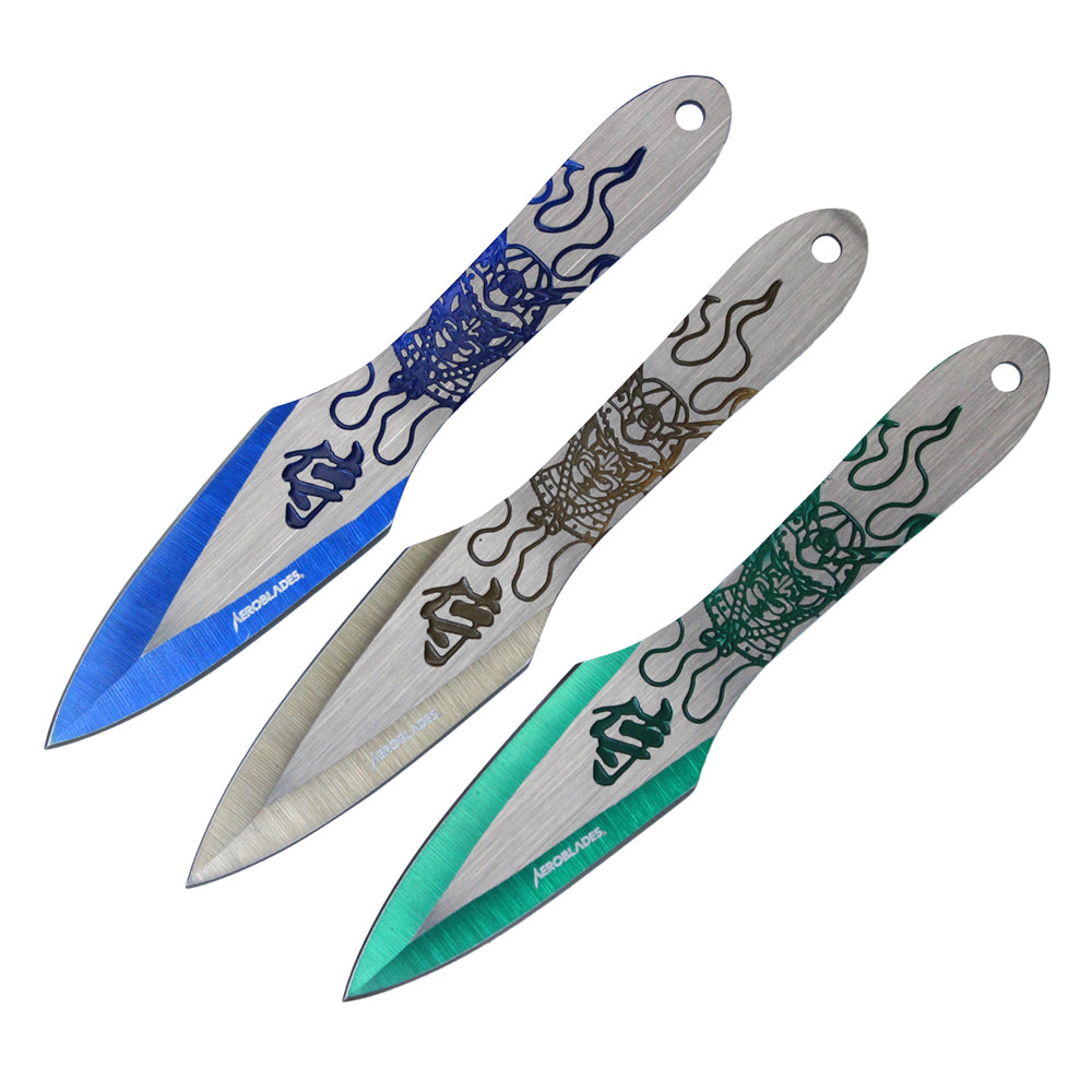 6.5" Inch 3Pc Mixed Color Stainless Steel Japanese Warrior Mask Thrower Knife Set (Blue, Silver, Teal)