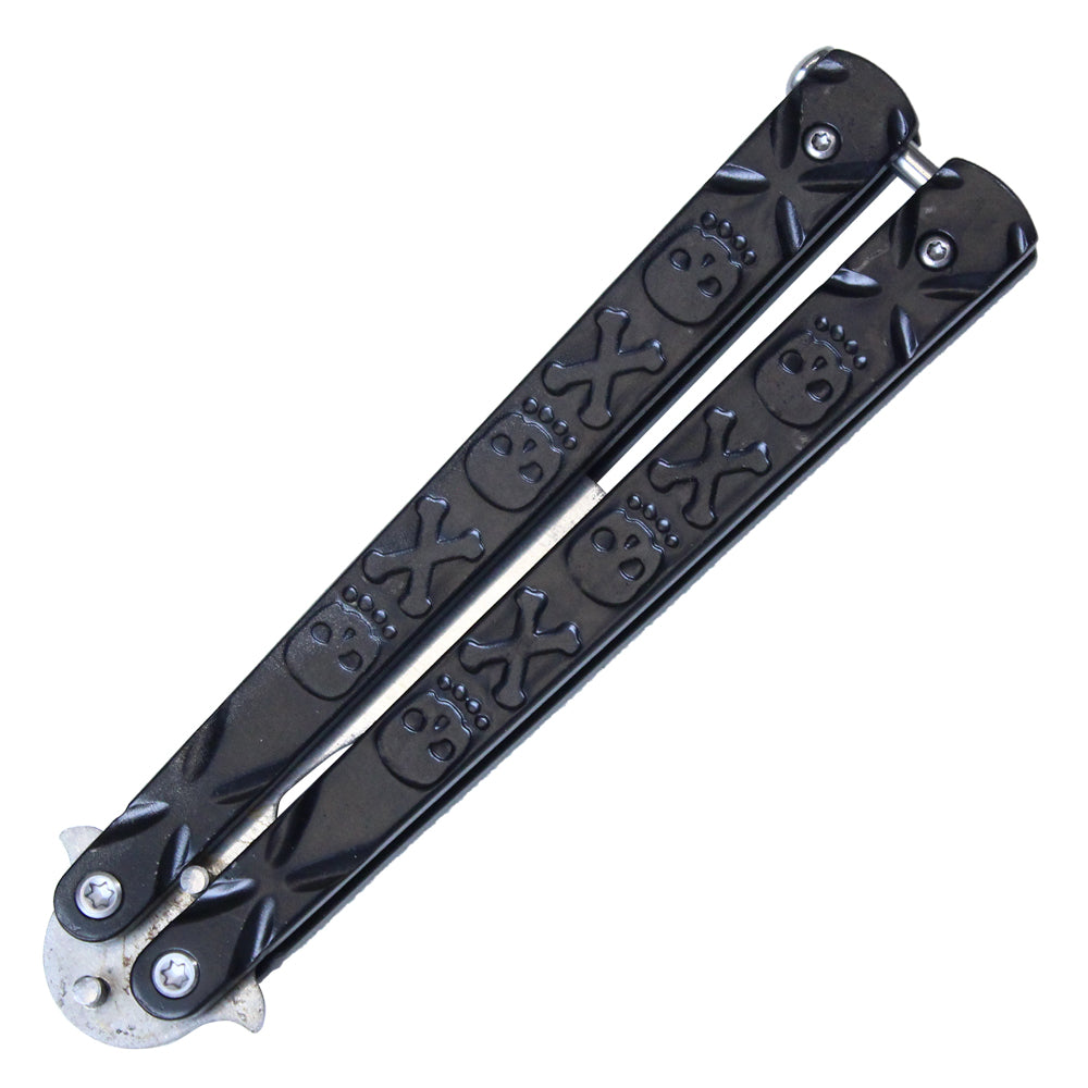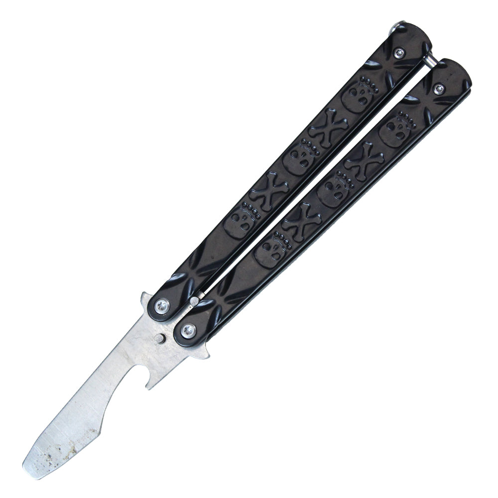 7.50" Inch Beer Bottle Opener Stainless Steel Balisong Training Knife w/ Black Skull and Cross Bone Handle