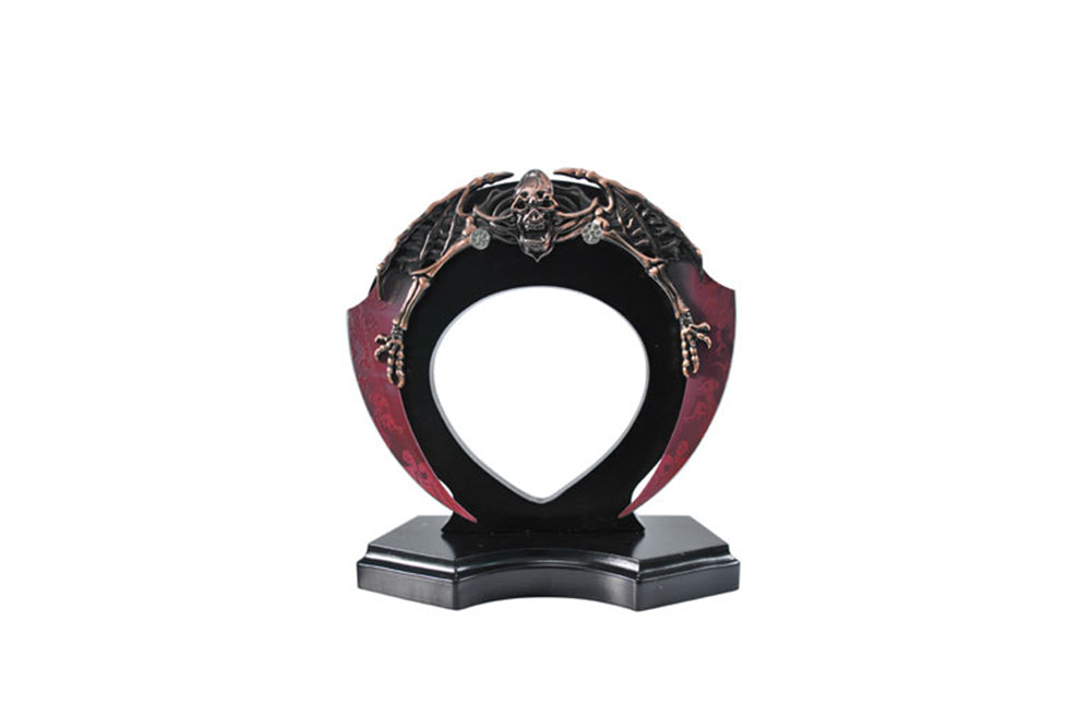The Waning Moon Dagger is a compact yet fierce collectible piece inspired by gothic and fantasy weaponry. Measuring 6.5 inches across, this crescent-shaped dagger features deep red and black tones with a skeletal motif crawling across its upper arc. Designed with a hollow center and sharp interior edges, its unique silhouette captures the eerie elegance of a waning moon. The set includes a matching wood display stand, perfect for showcasing the dagger’s intricate details and dramatic shape. Ideal for fans of dark fantasy, horror themes, or standout desk displays.