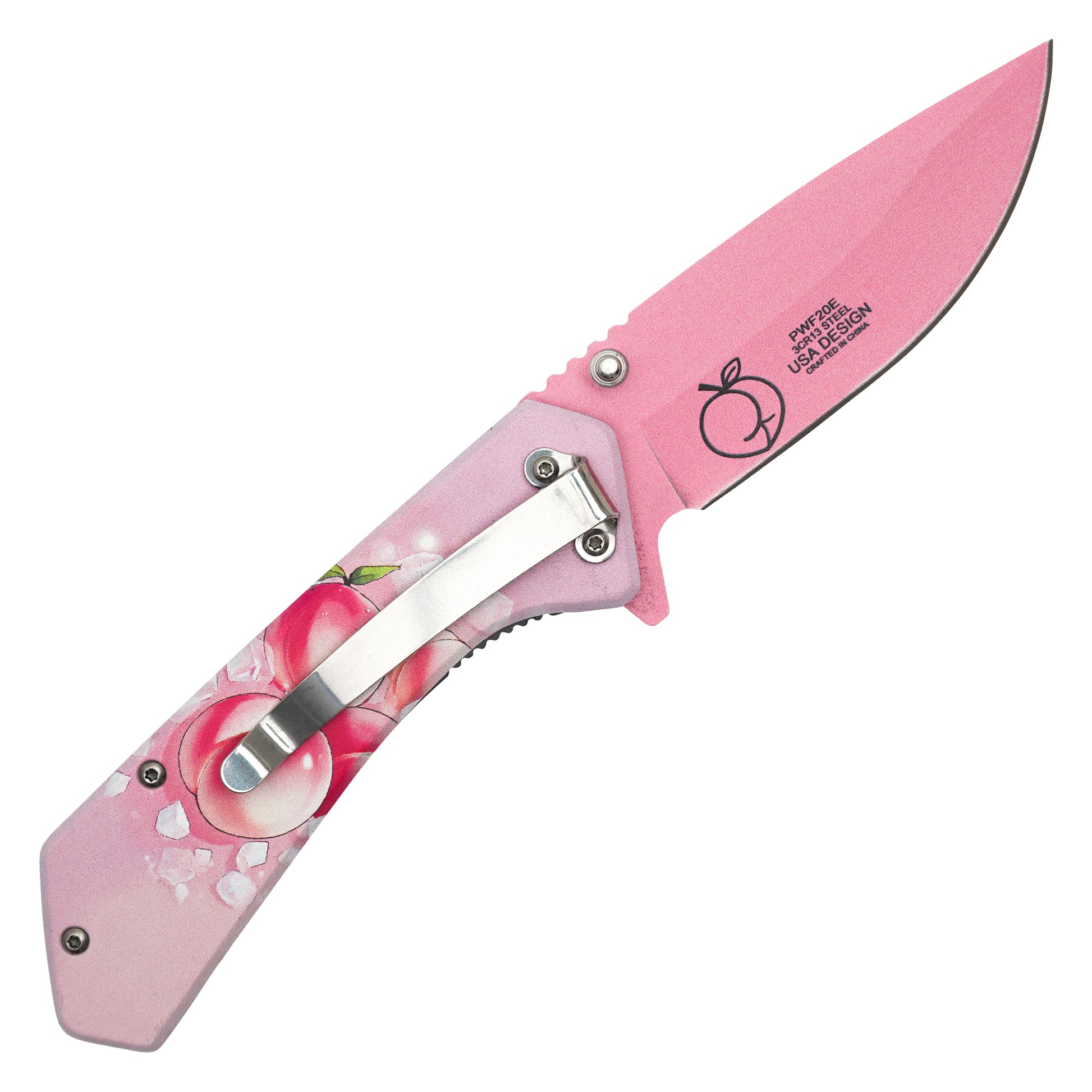 The Wartech Pink Peaches Spring Assisted Pocket Knife offers a compact everyday carry with quick deployment and a bright, fruit-inspired design. It features a 3.25" pink graphic steel blade designed for light daily cutting and general utility. The 4.5" pink peaches print handle adds vibrant visual character while maintaining a comfortable, balanced feel. The spring-assisted opening ensures fast, smooth blade action, and a belt clip makes it easy to carry. A fun, affordable EDC knife with standout style.