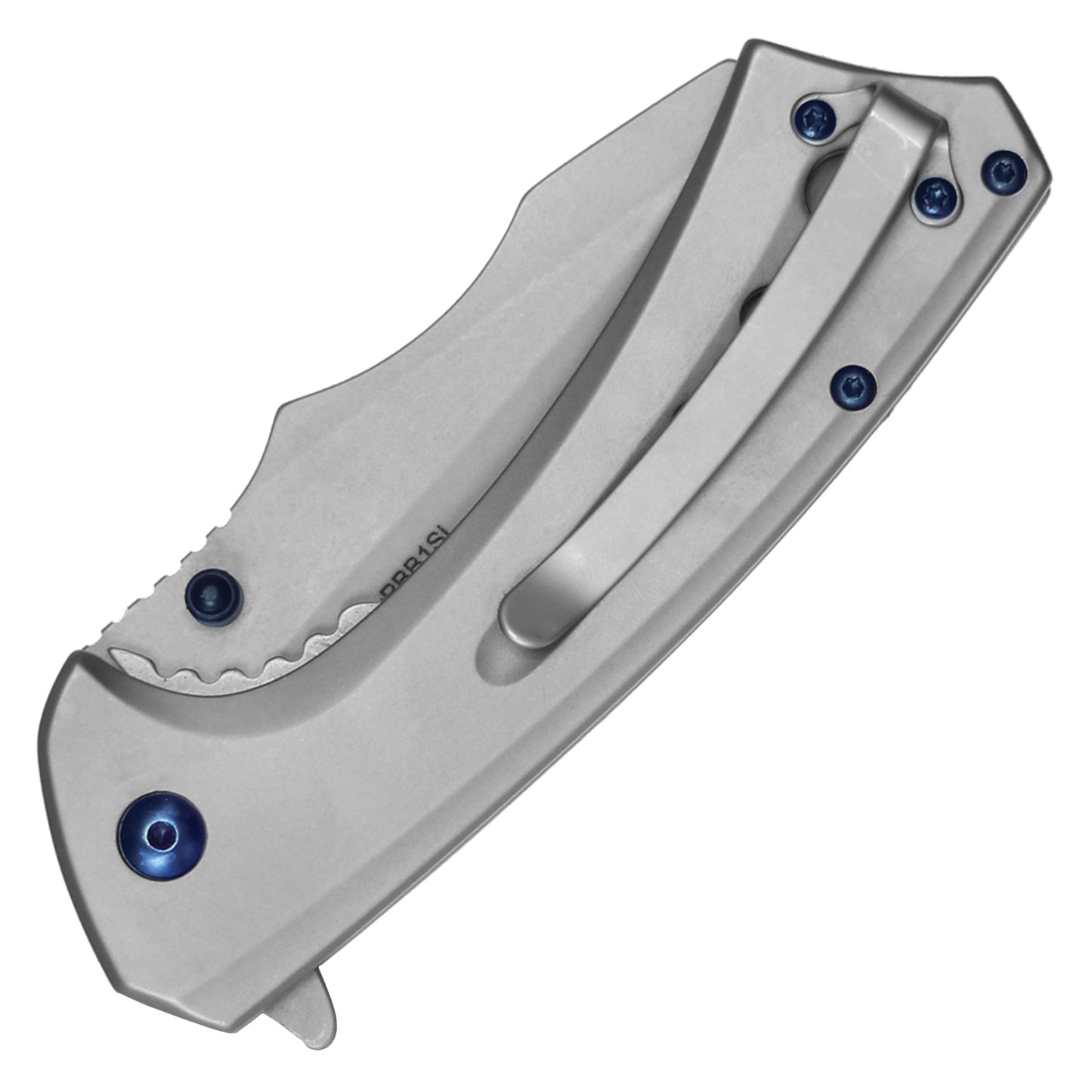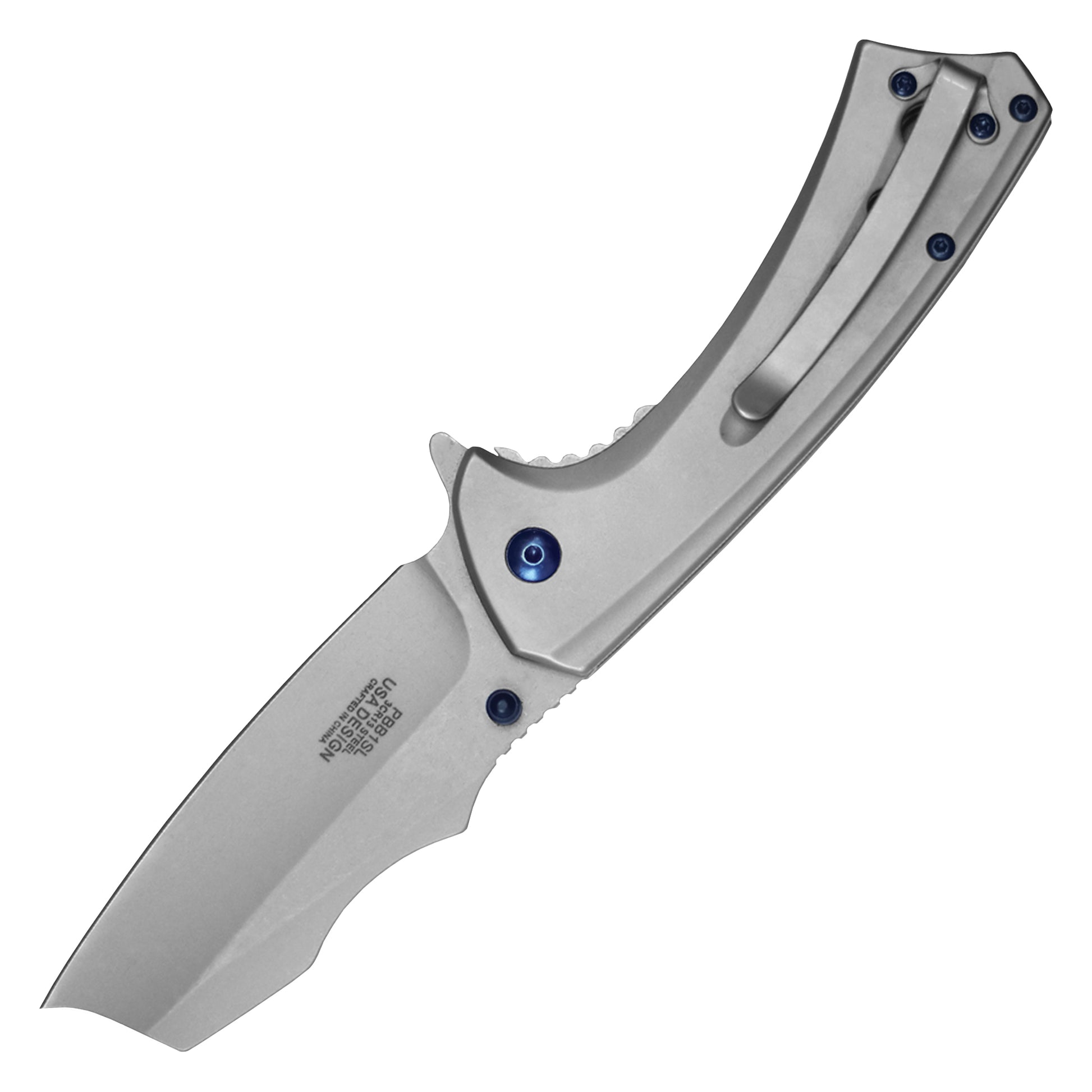 The Silver Blue Ball Bearing Pocket Knife is a rugged, futuristic design built for fast deployment and reliable use. Featuring a 3.25" stainless steel blade with a modified cleaver-style shape, this knife offers bold cuts and tough performance. The 4.5" stainless steel handle showcases drilled hole accents and blue pivot hardware for added style. Perfect for everyday carry or display, this Spring Assisted Pocket Knife opens quickly with a flipper tab and locks solid with a liner lock system.